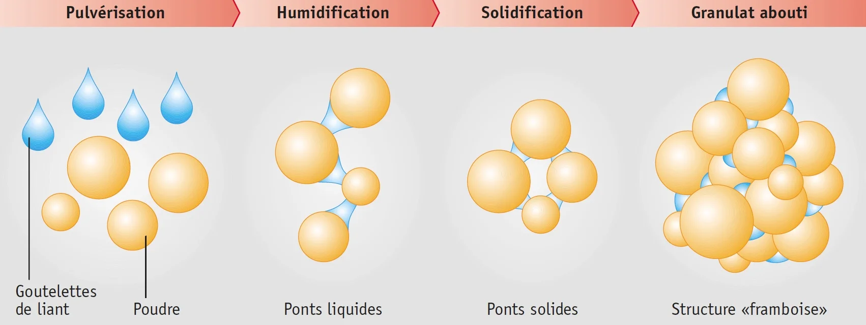 La poudre est introduite en continu dans la chambre. Dans la première zone, le liquide est pulvérisé sur les particules fluidisée jusqu’à agglomération, puis séchés et refroidis dans les zones adjacentes.